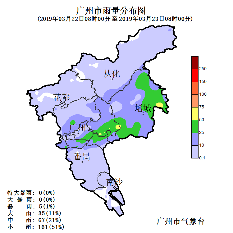 受切變線和冷空氣共同影響,2019年3月22日白天至夜間我市出現(xiàn)了一次中到大雨,局部暴雨的天氣過程,局部伴有短時(shí)強(qiáng)降水和雷電。據(jù)統(tǒng)計(jì),22日08時(shí)至23日08時(shí),全市平均雨量10mm,5個(gè)測(cè)站錄得50mm(暴雨)以上的雨量,35個(gè)測(cè)站錄得25mm(大雨)以上的雨量,其中增城區(qū)正果鎮(zhèn)錄得全市最大雨量61.3mm,增城區(qū)仙村站錄得最大小時(shí)雨強(qiáng)39.1mm;海珠區(qū)琶洲公園錄得中心城區(qū)最大雨量36.1mm,橋頭公園錄得小時(shí)最大雨量24.4。