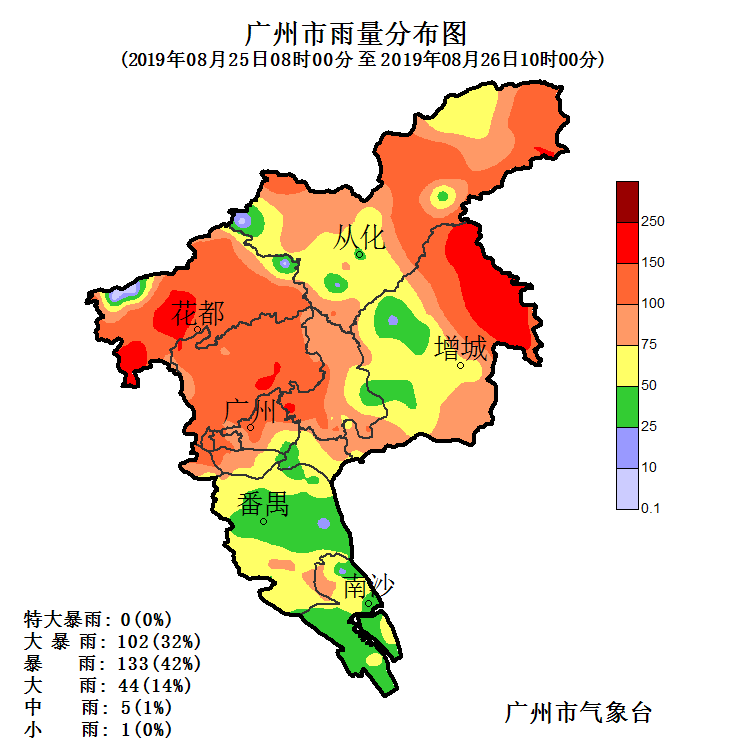 受“白鹿”影響,25日白天到26日上午廣州市普遍出現暴雨到大暴雨,部分地區伴有8-9級短時大風。25日08時至26日10時,全市平均面雨量86.4毫米,328個站點(79%)錄得50毫米以上的降水,其中141個站點(34%)錄得100毫米以上的降水,增城區背陰村錄得全市最大雨量215.1毫米。各區平均面雨量分別為(單位:毫米):花都120.7,白云113.4,越秀100.7,增城91.4,從化89.7,荔灣89.1,海珠77.7,黃埔74.8,天河74,南沙53.3,番禺46.4。144個站點(49%)錄得6級以上的短時大風,番禺區石樓鎮錄得全市最大陣風22.4米每秒(9級)。