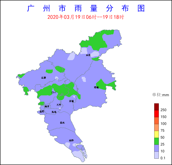 3月19日白天,廣州市自北向南出現(xiàn)了中到大雨。據(jù)氣象水文監(jiān)測網(wǎng)統(tǒng)計(jì),19日06時(shí)至18時(shí),全市平均面雨量為18.5毫米,共55個(gè)站點(diǎn)(占總數(shù)13%)錄得25毫米以上降水,其中荔灣區(qū)西灣路錄得全市最大雨量35.2毫米和全市最大小時(shí)雨強(qiáng)19.6毫米。各區(qū)最大累計(jì)雨量(單位:毫米):越秀27,荔灣35.2,天河32,海珠21.8,黃埔31,白云33,番禺18.3,南沙15.2,花都34.1,從化29.1,增城29.2。