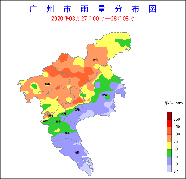 2020年3月27日中午至28日凌晨,受高空槽、切變線和冷空氣影響,我市中北部地區出現了大到暴雨,局部大暴雨,大部地區出現6~8級雷雨大風,局部出現冰雹。據氣象水文監測站網統計,27日11時至28日0時30分,全市平均雨量44.4毫米,70個站點(17%)錄得30~50毫米降水,165個站點(40%)錄得50~100毫米降水,10個站點(2%)錄得100毫米以上的降水,從化區大坳上錄得全市最大雨量118毫米。各區最大雨量分別為(單位:毫米):越秀89.5,花都113.9,白云96,天河80.2,荔灣114.4,從化118,海珠46.6,黃埔107.8,增城85.2,番禺60.5,南沙16.9;全市12個(3%)測站出現7級及以上陣風,南沙區南沙街錄得全市最大陣風20.9米/秒(9級)。
