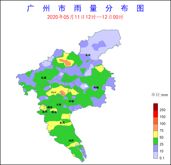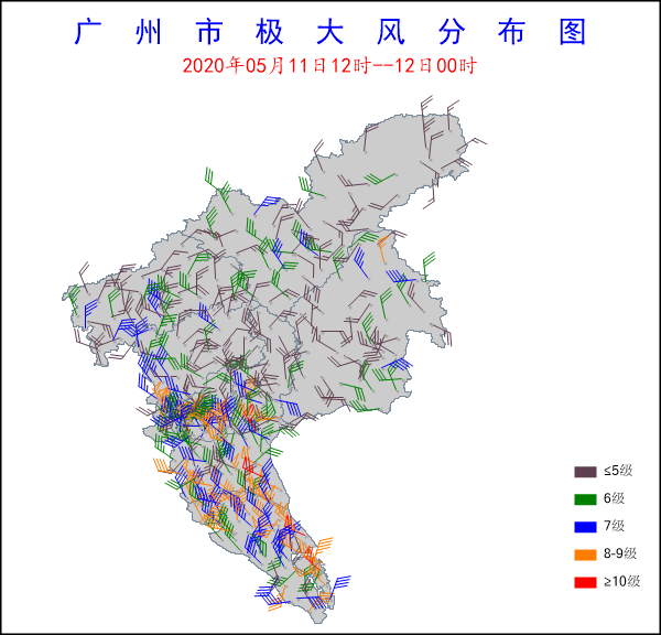 2020年5月11日中午到夜間,受冷空氣和切變線影響,廣州出現(xiàn)大到暴雨局部大暴雨過(guò)程,并伴有強(qiáng)雷電和8級(jí)以上大風(fēng)。據(jù)統(tǒng)計(jì),自11日12時(shí)至24時(shí),全市平均面雨量為29毫米,189個(gè)站點(diǎn)(53%)錄得25~50毫米降水,73個(gè)站點(diǎn)(20%)錄得50~100毫米降水,1個(gè)站點(diǎn)錄得100毫米以上降水,白云區(qū)太和鎮(zhèn)穗豐村錄得全市大降水量104.8毫米。各區(qū)最大雨量分別為(單位:毫米):南沙60.8,番禺73,黃埔62.6,荔灣65.4,海珠64.1,白云104.8,從化84.5,天河56.9,越秀55.3,花都54.1,增城64.7。全市共有57個(gè)站點(diǎn)(15%)出現(xiàn)8級(jí)以上大風(fēng),南沙區(qū)南沙街虎門(mén)大橋錄得全市最大陣風(fēng)25.7米/秒(10級(jí))。