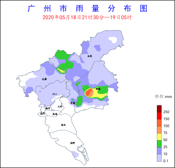 受高空波動和邊界層輻合線影響,18日21時30分起,雷雨云團在增城原地生成發(fā)展且穩(wěn)定少動,19日02時前后移至從化南部鰲頭鎮(zhèn)附近。據氣象-水文站監(jiān)測統(tǒng)計,18日21時30分至19日05時,增城、從化出現大到暴雨局部大暴雨,增城朱村街錄得最大累計雨量114毫米,從化鰲頭鎮(zhèn)錄得最大累計雨量40.3毫米,雨量較大站點還有:增城荔湖街83毫米,增城荔城街53.2毫米。