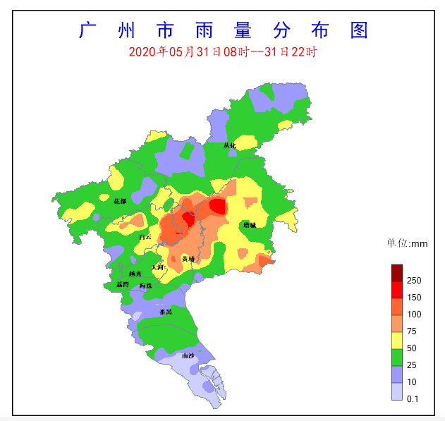 2020年5月31日早晨至夜間,受雷雨云團影響,我市出現大到暴雨局部大暴雨。08時至22時,全市平均面雨量39.1毫米,共有267個測站錄得25毫米以上的雨量,76個測站錄得50毫米以上的雨量,15個測站錄得100毫米以上的雨量,其中增城區中新鎮聯錄得全市最大雨量173.4毫米;全市共出現閃電27985次。