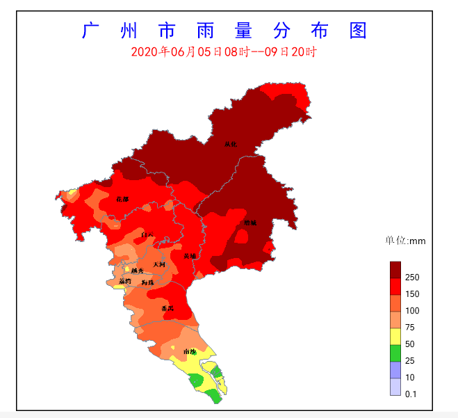 累積雨量大:5日08時至9日20時,增城、從化和花都分別錄得各區(qū)過程最大累積降水量689.3毫米(增城正果)、477.1毫米(從化鰲頭)和461.3毫米(花都梯面)。其中增城正果過程最大累積降水量為2005年以來第一大值(第二大值為2013年8月13-17日從化呂田的688.4毫米)。全市364個站出現(xiàn)降水(占比100%),其中350個站(占比96.1%)出現(xiàn)50毫米以上累積降水,274個站(占比75.2%)出現(xiàn)100毫米以上累積降水,74個站(占比20.3%)出現(xiàn)250毫米以上累積降水。全市平均累積面雨量為177.2毫米,各區(qū)過程累積面雨量:從化區(qū)337.7毫米、增城區(qū)322.3毫米、花都區(qū)199.2毫米、黃埔區(qū)166.8毫米、番禺區(qū)139.0毫米、白云區(qū)145.8毫米、南沙區(qū)82.0毫米、海珠區(qū)83.3毫米、荔灣區(qū)83.9毫米、天河區(qū)81.5毫米、越秀區(qū)69.4毫米。