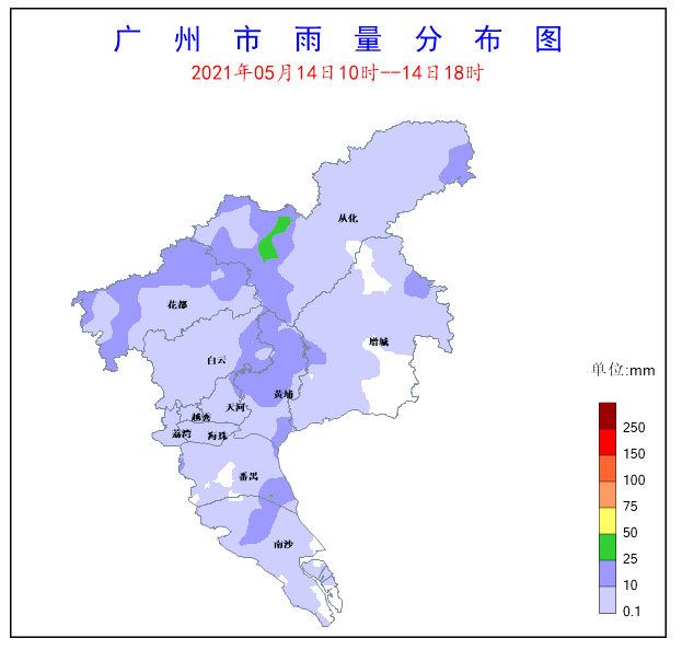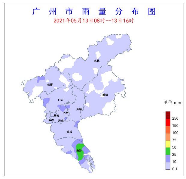 受低層偏南氣流影響,5月13日8時至13日16時南沙區出現了中到大雨,局部暴雨,其余各區大部出現了小到中雨,局部伴有6-9級陣風和強雷電。全市共有2個測站(占比0.55%)雨量超過50毫米,9個測站(占比2.49%)雨量超過25毫米,南沙區珠江街錄得全市最大累積雨量63.7毫米,同時該站錄得全市最大小時雨量33.3毫米。另外,全市共有20個測站(占比5.52%)錄得6級以上陣風,花都區花東鎮花都區花東鎮錄得全市最大陣風23m/s(9級)。