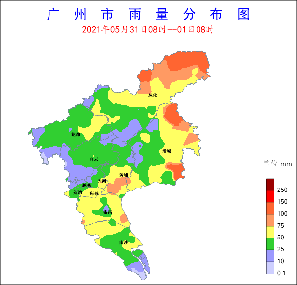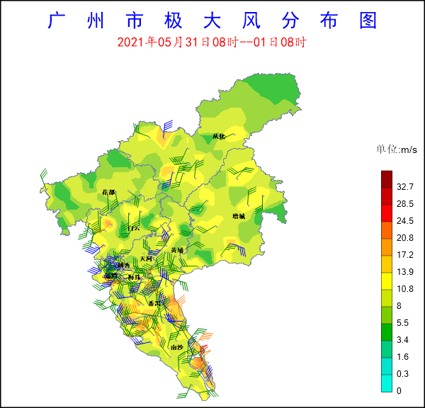 受西南氣流影響,2021年5月31日8時(shí)至1日8時(shí),全市共有363個(gè)測站(100%)出現(xiàn)降雨,全市平均雨量48.4毫米,12個(gè)測站(3.31%)雨量超過100毫米,154個(gè)測站(42.42%)雨量超過50毫米,125個(gè)測站(34.44%)雨量超過25毫米。雨量較大的站點(diǎn)有:從化呂田東明國家氣象觀測站140.4mm,增城區(qū)派潭鎮(zhèn)七境小學(xué)135.7mm,增城區(qū)石灘鎮(zhèn)三江建設(shè)路133.9mm,從化呂田東聯(lián)氣象觀測站130.8mm,從化良口仙溪?dú)庀笥^測站122.4mm。全市共有:1個(gè)測站(0.28%)錄得10級(jí)以上陣風(fēng),17個(gè)測站(4.68%)錄得8級(jí)以上陣風(fēng),14個(gè)測站(3.86%)錄得6級(jí)以上陣風(fēng)。風(fēng)力較大的站點(diǎn)有:南沙區(qū)龍穴街龍穴村四涌舊堤24.5m/s,南沙區(qū)龍穴街舢舨洲23.9m/s,番禺區(qū)石樓鎮(zhèn)工業(yè)路22.2m/s,白云區(qū)人和鎮(zhèn)西湖村21.4m/s,番禺區(qū)新造鎮(zhèn)崇德村20.1m/s。