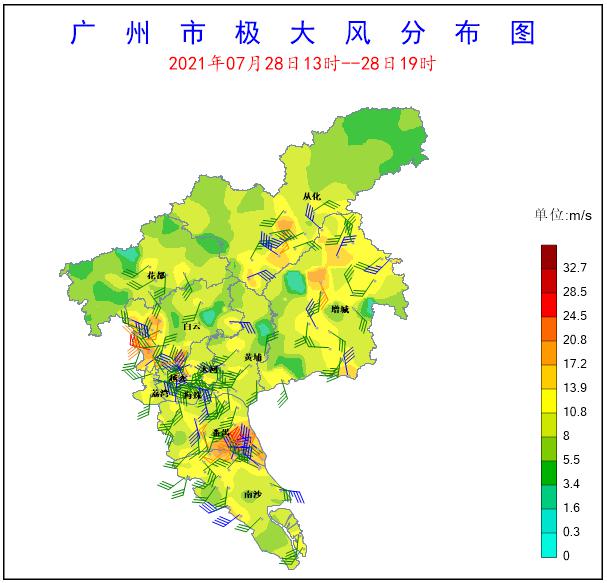 強度強:全市18個測站(5%)小時雨強超50毫米,白云區景泰北街錄得全市最大小時雨強84.4毫米(17-18時);全市共9個測站(2.5%)3小時雨量超100毫米,最大值143.3毫米出現在白云區景泰北街(16-19時)。多個測站錄得8~11級短時大風,其中番禺區石樓鎮清流村錄得全市最大瞬時大風31.1m/s(11級)。期間,我市多個區發布了暴雨和雷雨大風預警信號,其中越秀、天河、白云區發布了暴雨紅色預警信號。