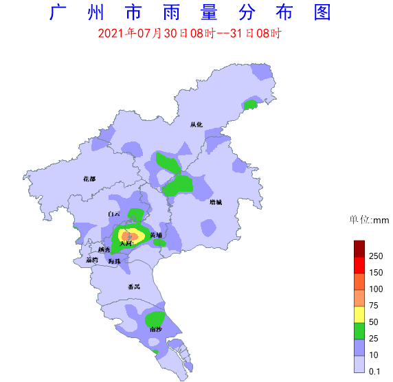 受西南氣流和弱切變的影響,2021年7月30日10時至16時,我市天河區(qū)、黃埔區(qū)、南沙區(qū)、白云區(qū)、增城區(qū)出現(xiàn)了中到強雷雨,其余地區(qū)有雷陣雨,全市共有266個測站(73.48%)出現(xiàn)降雨,全市平均雨量8.2毫米,1個測站(0.28%)雨量在100~250毫米之間,9個測站(2.49%)雨量在50~100毫米之間,22個測站(6.08%)雨量在25~50毫米之間。各區(qū)平均雨量(單位:毫米):越秀區(qū)0.1mm,天河區(qū)35.2mm,荔灣區(qū)0mm,海珠區(qū)8.2mm,白云區(qū)7.6mm,黃埔區(qū)16.4mm,番禺區(qū)2.3mm,南沙區(qū)12.1mm,花都區(qū)1.5mm,增城區(qū)5.2mm,從化區(qū)7.6mm。