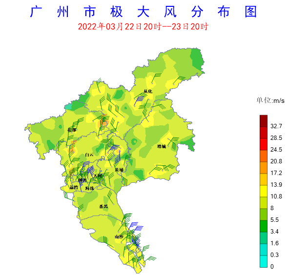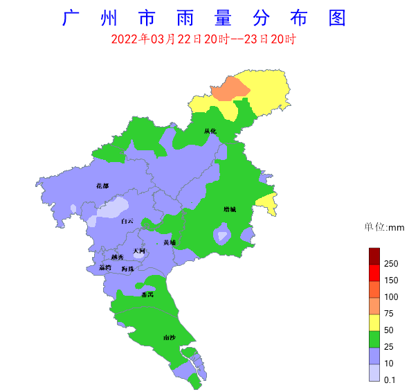 22日20時至23日20時,受冷空氣和切變線共同影響,我市各區均出現了明顯降水,從化、增城、番禺、南沙區出現了大到暴雨,其余各區出現了中到大雨。全市共有385個測站(100%)出現降雨,全市平均雨量25.22毫米,17個測站(4.42%)雨量在50~100毫米之間,136個測站(35.32%)雨量在25~50毫米之間。各區平均雨量(單位:毫米):越秀區17.9,天河區20.8,荔灣區18.8,海珠區12.8,白云區14.4,黃埔區21.6,番禺區29.3,南沙區36.2,花都區15.2,增城區29.4,從化區35.8,從化區良口鎮錄得全市最大累積雨量80.1毫米。另外,白云區人和鎮錄得全市最大瞬時大風23.7米/秒(9級)。