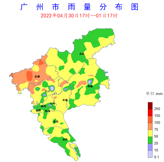 4月30日17時至5月1日17時,受冷空氣、切變線、熱帶系統共同影響,我市大部地區出現暴雨,花都部分地區出現大暴雨。全市共有365個測站(95.3%)出現降雨,4個測站(1%)雨量在100~250毫米之間,196個測站(51.2%)雨量在50~100毫米之間,49個測站(12.8%)雨量在25~50毫米之間,花都區獅嶺鎮錄得全市最大累積雨量126.5毫米。全市平均雨量59.1毫米,各區平均雨量:越秀區51.8毫米,天河區66.4毫米,荔灣區56.5毫米,海珠區56毫米,白云區64.8毫米,黃埔區61.2毫米,番禺區56.3毫米,南沙區50.3毫米,花都區81.5毫米,增城區53.8毫米,從化區52.5毫米。本次過程有14個測站錄得小時雨強超過20毫米的短時強降水,最大小時雨量31.9毫米,出現在花都區赤坭鎮。另外,過程中我市有60個測站出現6-8級大風,白云區太和鎮帽峰山錄得全市最大瞬時大風17.5米/秒(8級)。