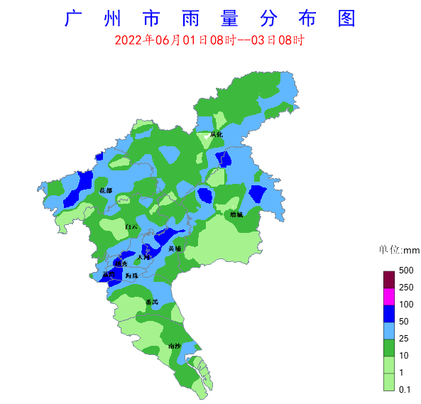 6月1日08時(shí)至3日08時(shí),受西南氣流影響,我市普遍出現(xiàn)大到暴雨降水過(guò)程。全市共有380個(gè)測(cè)站(94.1%)出現(xiàn)降雨,全市平均雨量25.6毫米,1個(gè)測(cè)站(0.2%)雨量在100~250毫米之間,48個(gè)測(cè)站(11.9%)雨量在50~100毫米之間,111個(gè)測(cè)站(27.5%)雨量在25~50毫米之間。各區(qū)平均雨量(單位:毫米):海珠區(qū)61.9,天河區(qū)61.3,越秀區(qū)57.7,荔灣區(qū)32.9,黃埔區(qū)30.7,花都區(qū)26.2,從化區(qū)22.5,白云區(qū)19.4,增城區(qū)18.8,番禺區(qū)18,南沙區(qū)13.2。