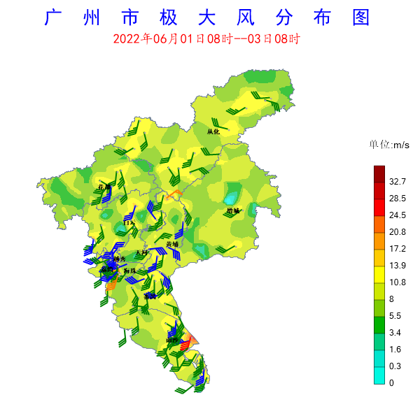 其中海珠區(qū)鳳陽(yáng)街錄得最大累積雨量102.9毫米,海珠區(qū)南石頭街得最大小時(shí)雨強(qiáng)49.5毫米。過(guò)程伴有強(qiáng)雷電和短時(shí)大風(fēng),全市共95個(gè)測(cè)站錄得6~8級(jí)陣風(fēng),南沙區(qū)南沙街錄得全市最大陣風(fēng)31.8米/秒。