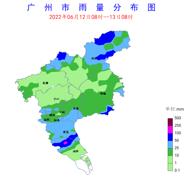 6月12日08時至13日08時,受低渦切變和西南氣流共同影響,我市普遍出現(xiàn)大到暴雨局部大暴雨降水過程。全市共有373個測站(92.3%)出現(xiàn)降雨,全市平均雨量20.5毫米,3個測站(0.7%)雨量在100~250毫米之間,20個測站(5%)雨量在50~100毫米之間,105個測站(26%)雨量在25~50毫米之間。各區(qū)平均雨量(單位:毫米):番禺區(qū)35.8,荔灣區(qū)32,越秀區(qū)26,從化區(qū)24.3,海珠區(qū)23.6,黃埔區(qū)22.5,天河區(qū)21.8,南沙區(qū)20.6,增城區(qū)17.1,白云區(qū)10.2,花都區(qū)7.8。其中南沙區(qū)欖核鎮(zhèn)錄得最大累積雨量114.6毫米,南沙區(qū)東涌鎮(zhèn)得最大小時雨強(qiáng)95.7毫米。過程伴有強(qiáng)雷電和短時大風(fēng),全市共20個測站(5%)錄得8~10級陣風(fēng),109個測站(27%)錄得6~8級陣風(fēng),天河區(qū)前進(jìn)街錄得全市最大陣風(fēng)23.5米/秒。
