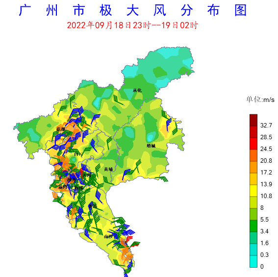 圖2 2022年9月18日23時至19日02時廣州極大風分布圖