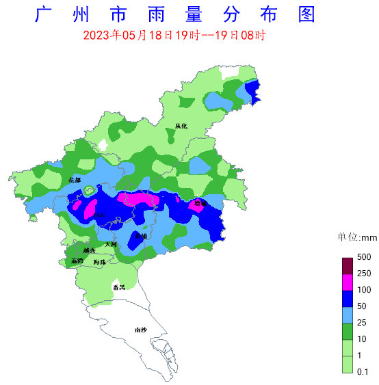 5月18日19時至19日08時,受高空下滑波動和近地層切變線影響,我市中部地區(qū)(白云-黃埔-增城)出現(xiàn)了暴雨、局部大暴雨降水,并伴有短時強降水、雷雨大風、強雷電等強對流天氣。期間,全市共有361個測站(77.5%)出現(xiàn)降雨,平均雨量21.5毫米,其中15個測站(3.2%)雨量在100~250毫米之間,37個測站(7.9%)雨量在50~100毫米之間,黃埔區(qū)龍湖街錄得全市最大累積雨量180.1毫米。各區(qū)平均雨量(單位:毫米):黃埔區(qū)47.5,白云區(qū)44.7,增城區(qū)35.4,花都區(qū)24.9,越秀區(qū)20.2,天河區(qū)19.5,荔灣區(qū)19.5,從化區(qū)12.2,海珠區(qū)10.3,番禺區(qū)0.9,南沙區(qū)0。過程雨強較大,全市有109個測站錄得小時雨量超過20毫米的短時強降水,其中15個測站小時雨強超過50毫米,黃埔區(qū)蘿崗街道辦錄得最大小時雨強84.8毫米。同時,過程還伴有強雷電和雷雨大風,全市共117個測站(25%)錄得6級以上陣風,其中14個測站(3%)錄得8~9級陣風、103個測站(22.1%)錄得6~7級陣風,白云區(qū)帽峰山錄得全市最大瞬時大風21.2米/秒(9級)。